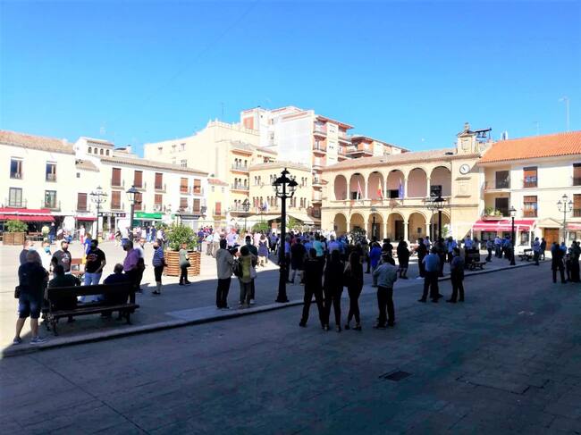 Centenares de personas han paralizado, por unas horas la vendimia y se han concentrado en la Plaza Ramón y Cajal de Villarrobledo para protestar por los bajos precios de la uva, que no cubren los costes de producción de los agricultores.