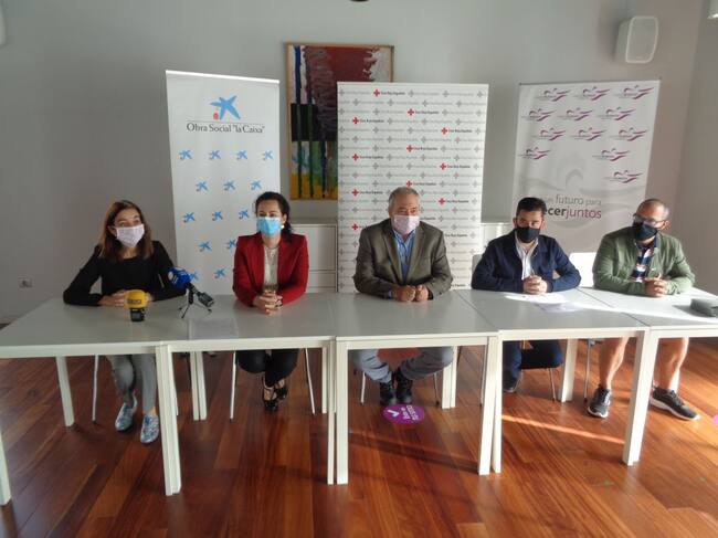 De izq a dcha, Laura Cabañes, responsable de Comunicación de Caja de Burgos, María Natividad de Blas, directora de la Oficina Store de Caixabank en Aranda de Duero, Miguel Ángel Pinto, director de las Aulas de Medio Ambiente de la Fundación Caja de Burgos, José Agustín Escudero, presidente de la Asamblea Comarcal de Cruz Roja y Carlos Fernández, concejal de Medio Ambiente / Cadena SER