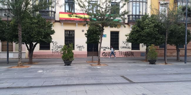 Las sedes del PP andaluz en la calle San Fernando, la del PSOE de Sevilla en la calle Luis Montoto y la de Podemos Andalucía han amanecido este miércoles con pintadas en sus fachadas. En la sede de los populares se lee: "Cobardes. Distancia No. Toros sí. Quiero trabajar". Y en la de los socialistas, con idéntica grafía: "Toros sí. Sánchez vete".
