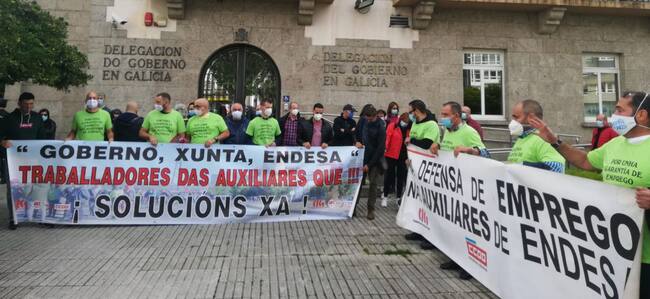 Delegados sindicales de las empresas auxiliares de Endesa se han concentrado ante la Delegación del Gobierno en demanda de una mesa de trabajo específica sobre su futuro una vez se cierre la térmica de As Pontes. Son una veintena de empresas y unos 300 puestos de trabajo.