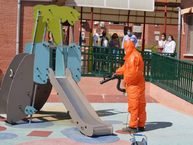 Un operario de la contrata de limpieza desinfecta unos juegos infantiles en un colegio