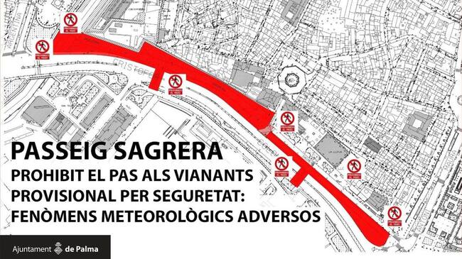El Ayuntamiento de Palma restringirá a partir de este viernes a las 16.00 horas los accesos peatonales de las zonas de Paseo Sagrera y Dalt Murada hasta que finalice la alerta amarilla de la Agencia Estatal de Meteorología (Aemet) por los fuertes vientos previstos.