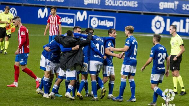 Los jugadores del Oviedo celebran la victoria ante el Sporting. / La Liga