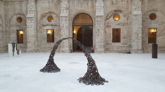 El consistorio arandino ha cedido temporalmente la escultura ‘Poema Arco’, que se instaló en mayo de 2017 junto al pórtico de la iglesia de San Juan. La galería, por su parte, lleva al Monasterio de San Juan de Burgos la exposición ‘Al contar’, una nutrida selección de las obras de arte realizadas por esta artista ovetense que formaron parte de aquella exposición al aire libre de hace casi tres años y medio, ‘Al contar del Duero’, donde su autora hizo emanar historias que contar de los edificios más emblemáticos del casco histórico de Aranda.