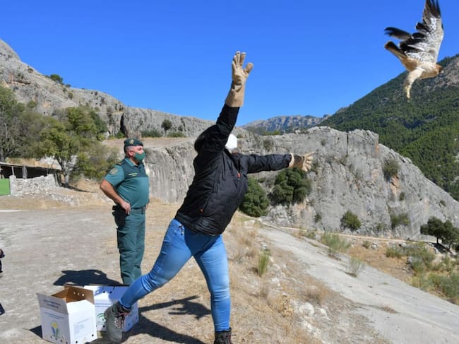 La suelta se ha llevado en un paraje del parque natural hasta donde se trasladó la delegada territorial de Agricultura, Ganadería, Pesca y Desarrollo Sostenible en Granada, María José Martín, la directora conservadora del Parque Natural Sierra de Castril, Mari Carmen García, los dos agentes de la Guardia Civil que encontraron a las águilas y dos agentes de Medio Ambiente.