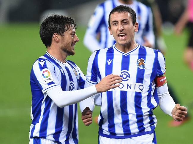 Oyarzabal recibe la felicitación de Silva con uno de sus dos goles / Juan Manuel Serrano Arce (Getty Images)