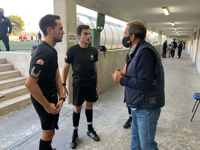 Manuel Maldonado, responsable de protocolo del Eldense, hablando con un trío arbitral / Cadena SER