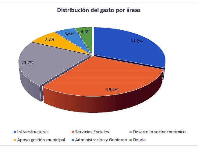 Una primera aproximación a las áreas de gasto revela que la Diputación empleará algo más del 31% del presupuesto a infraestructuras, cerca del 30% a servicios sociales, el 22% en fomento del em-pleo y el desarrollo socioeconómico de la pro-vincia y casi el 8% al apoyo a la gestión municipal, cuatro áreas que representan aproxima-damente nueve de cada diez euros del gasto. El resto se destina al propio funcionamiento general y gobierno de la administración (5,6%) y al pago de deuda, que apenas supone uno de ca-da veintidós euros que gestiona la Diputación (4,5%). Sobre este último aspecto —el endeudamiento—, cabe destacar que la deuda viva de la Diputación, a fecha 1 de enero de 2020 y tras liquidarse el presupuesto de 2019, asciende a poco más de 14,9 millones de euros y no llega al 25% de los ingresos corrientes consolidados (es decir, los ingresos regulares sin recurrir a préstamos, que el año anterior rondaron los sesenta millones de euros, incluso descontado unos 375.000 euros de ingresos por contribuciones especiales. Ese nivel de endeudamiento del 24,87% se sitúa lejos del límite del 110%, umbral a partir del cual existe la prohibición de concertar nuevas operaciones de crédito.