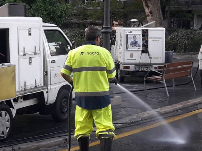Un operario de la empresa INAGRA baldea una calle de Granada en tareas de limpieza urbana / INAGRA