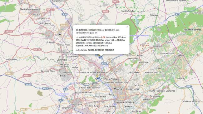 Un accidente de tráfico en la A-30 a la altura de las Urbanizaciones de Molina de Segura ha provocado esta mañana importantes retenciones de circulación de hasta 15 kms. en sentido Albacete. El siniestro ha ocurrido a las 6:40 horas, cuando un vehículo, una furgoneta, ha colisionado con un camión aparcado en el arcén, según la Guardia Civil de tráfico, y que ha dejado el carril derecho cerrado.