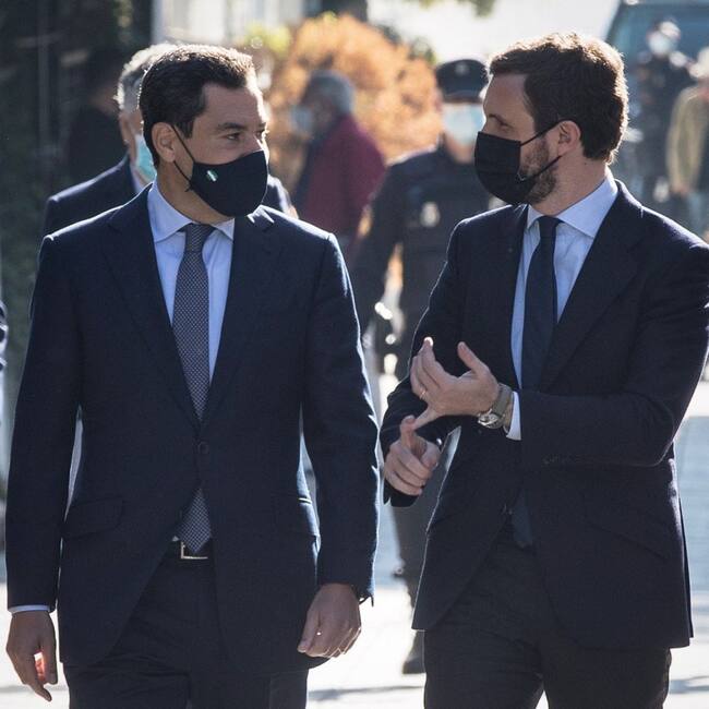 GRAFAND4567. SEVILLA, 02.12.2020.-El presidente del Partido Popular, Pablo Casado (d), conversa con el presidente del PP-A y jefe del Ejecutivo regional, Juanma Moreno, a su llegada hoy a Sevilla para participar en el acto conmemorativo del cambio de gobierno en Andalucía.EFE / José Manuel Vidal (EFE)