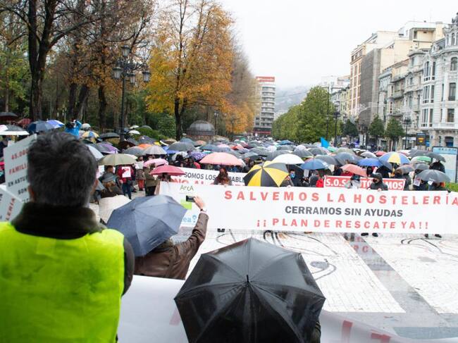 Cientos de hosteleros, unos 1.500 según fuentes policiales, han llevado este viernes su protesta al centro de Oviedo para mostrar su malestar por el cierre que pesa sobre el sector desde hace un mes. Al grito de "Barbón, dimisión" y "Queremos trabajar", los manifestantes han desarrollado su protesta en el Paseo de los Álamos de Oviedo en respuesta a una convocatoria de la patronal Otea realizada a raíz de que el Ejecutivo autonómico decidiese prorrogar el cierre del sector durante quince días más. Los manifestantes, que han hecho explotar varios petardos, han llegado a cortar el tráfico de la calle Uría durante varios minutos en los momentos iniciales de la concentración.