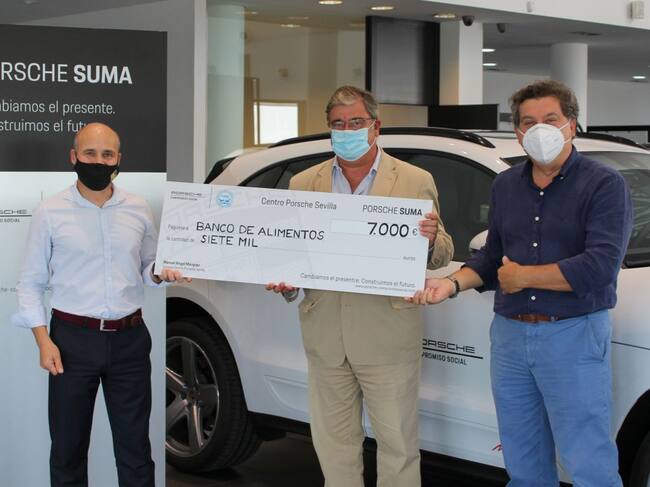 El Director Gerente de Centro Porsche Sevilla, Manuel Ángel Márquez, ha entregado a Agustin Vidal-Aragon y Agustin Alcaraz, presidente y vicepresidente del Banco de Alimentos de Sevilla, respectovamente, de un talón por valor de 7000 euros. Esta donación forma parte del proyecto solidario Porsche SUMA, una iniciativa que está llevando a cabo Porsche Ibérica junto con a su red de concesionarios.