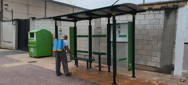 Un operario desinfecta una marquesina en Lahiguera.