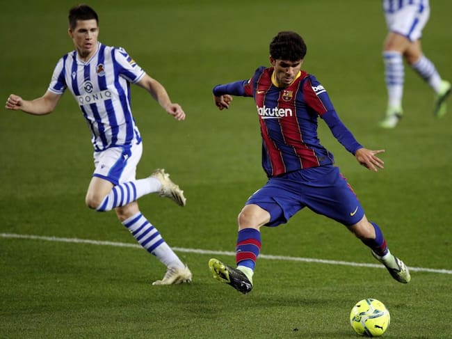 El centrocampista del FC Barcelona Carles Aleñá (d), durante el partido correspondiente a la decimonovena jornada de la LaLiga Santander ante la Real Sociedad disputado esta noche en el Nou Camp, en Barcelona. / Alejandro García (EFE)