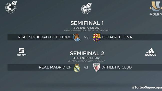La Real jugará por tanto contra el subcampeón de liga de la pasada temporada, porque al no haber campeón de Copa (la final entre los donostiarras y el Athletic aún no ha podido disputarse) se ha hecho un sorteo entre los dos equipos que van por la liga y los que van por la Copa. El Athletic y el Real Madrid deberán jugar la otra semifinal un día más tarde.