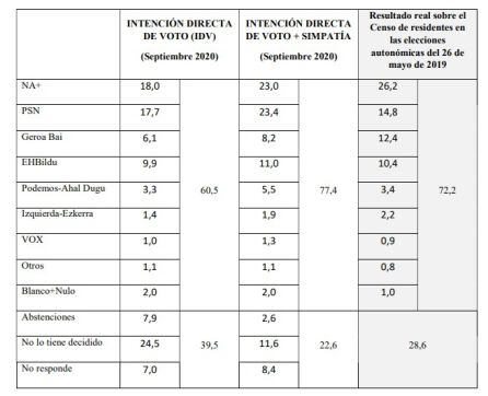 Así, el PSN es el único partido que sube en escaños en la intención de voto. Pasaría de 11 a 12 escaños y mantendría la condición de segunda fuerza del parlamento foral, distanciando en 4 escaños a la siguiente, Geroa Bai, que perdería uno para quedarse en 8. Navarra Suma sería de nuevo la lista más votada pero volvería a quedarse en 20 asientos, a 6 de la mayoría absoluta. EH Bildu mantendría sus 7 escaños y Podemos e IE también mantendrían su actual representación de 2 y 1 asiento respectivamente.