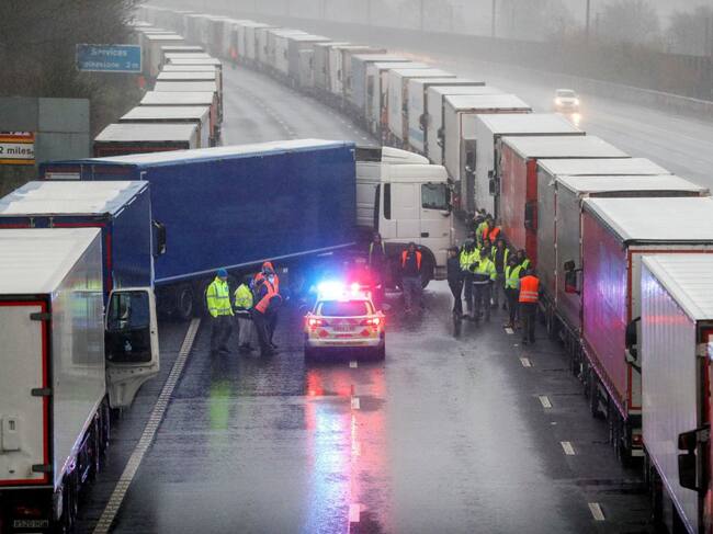 A lorry blocks M20 motorway where trucks queue to port Dover, as EU countries impose a travel ban from the UK following the coronavirus disease (COVID-19) outbreak, near Ashford, Britain, December 23, 2020. REUTERS Peter Nicholls / PETER NICHOLLS (Reuters)