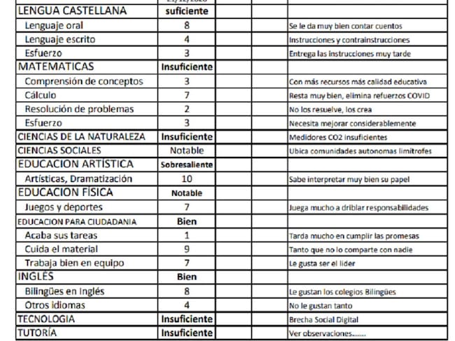 Las notas no son buenas. Por ejemplo, en el lenguaje escrito Ossorio ha sido calificado con un 4 por “instrucciones y contrainstrucciones”. Eso sí, en lenguaje oral obtiene un notable por su capacidad para “contar cuentos”, explican desde la FAPA.