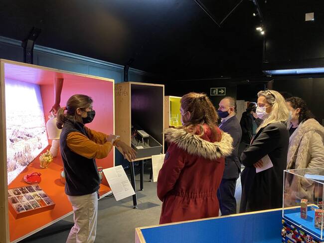 Representantes de las fundaciones organizadoras y del ayuntamiento atienden las explicaciones de una guía de la exposición / Cadena SER
