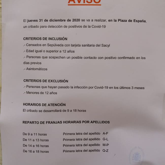La Consejería de Sanidad va a realizar un cribado masivo en el municipio de Sepúlveda ante el aumento de casos positivos y de brotes por covid 19 que se vienen sucediendo en los últimos días. A las 9 de la mañana un camión llegará a la Plaza de España para, hasta las 18 horas comenzar a realizar las pruebas. Un bando y distintos avisos ya se pueden ver por las calles de Sepúlveda informando a los vecinos que deberán acudir a este cribado a una hora en concreta en función de su apellido siempre y cuando no estén en cuarentena, sean mayores de 12 años, estén empadronados en la localidad y no hayan pasado la enfermedad en los 3 ultimos meses.