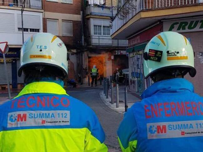 Imagen de la intervención en la calle Valdemoro de Getafe, con el fuego en el inmueble al fondo. / Summa 112