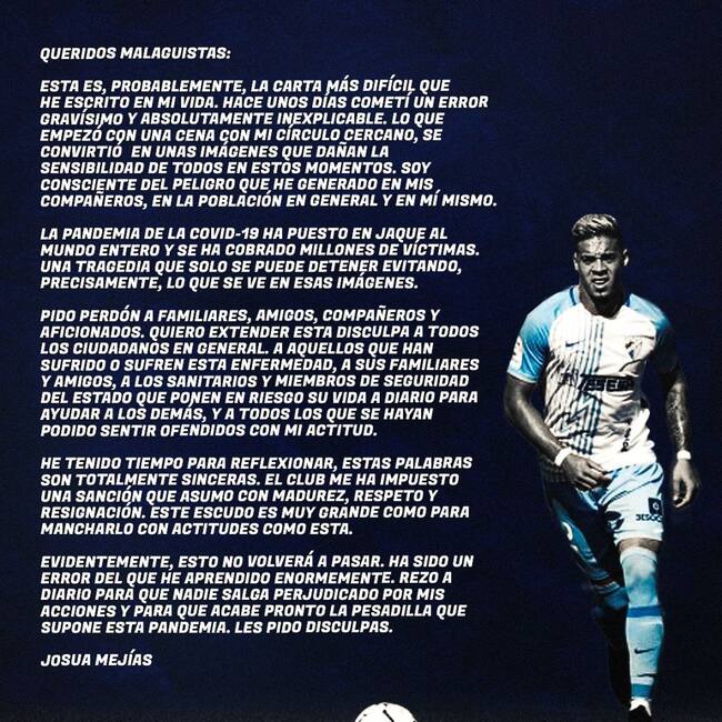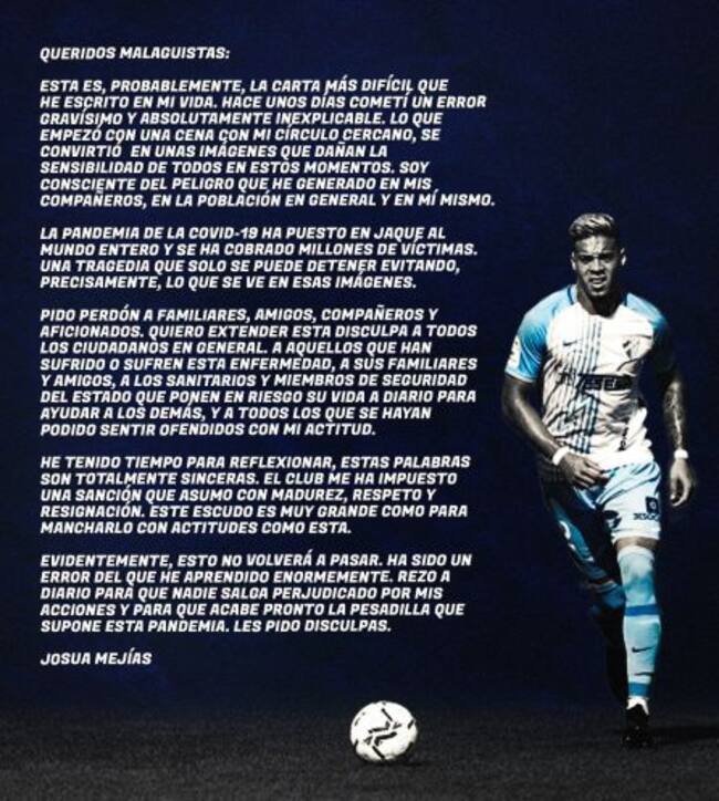 El defensa venezolano del Málaga Josua Mejías, pidió perdón por lo sucedido en la fiesta de despedida del año 2020 cuando acudió el pasado 31 de diciembre a una conocida discoteca de Marbella, donde no se guardaban las medidas de seguridad necesarias por la pandemia de coronaviruas.