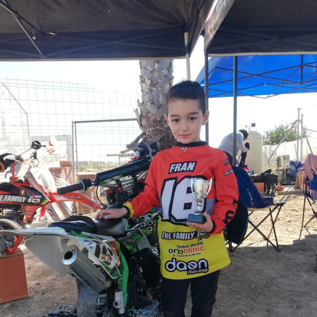Cuando nació, el piloto eldense de motocross Fran Espinosa Soriano parecía predestinado a subirse encima de una moto. Ahora, a punto de cumplir los cinco años de edad, está demostrando que su pasión por este deporte no era el capricho de un bebé y ya está montando una 50 C.C. formando parte de The Family 15 Racingque tiene su base en la localidad murciana de Santomera donde acude con sus padres Francisco José Espinosa y Sonia Soriano, para entrenar y codearse con otros chavales de su edad.
