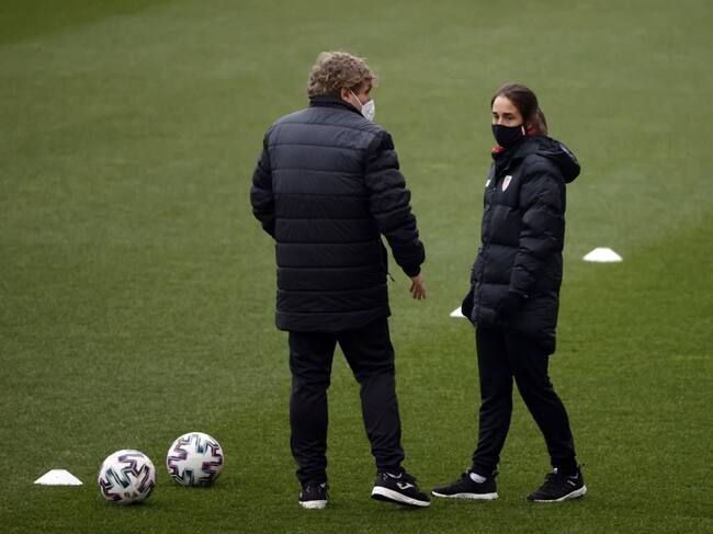 La entrenadora Iraia Iturregi (d), este domingo, en su estreno como nueva entrenadora del Athletic femenino en el derbi contra el Eibar en la inslaciones de Lezama. / Luis Tejido (EFE)