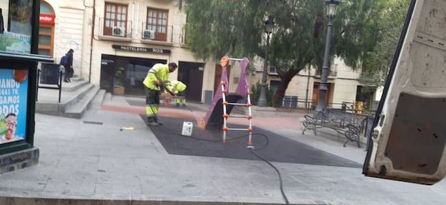 Foto de archivo. Trabajadores del Ayuntamiento de Yecla desinfectando una zona infantil de juegos / Cadena SER