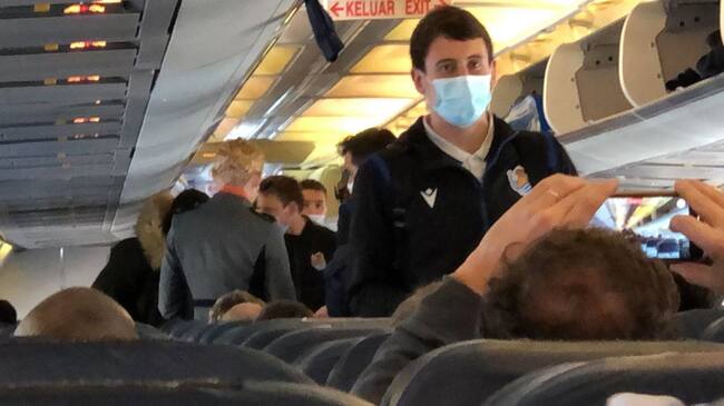 Caras de tristeza de los jugadores de la Real Sociedad y aplausos cariñosos al entrar en el avión que los llevó de regreso a Donostia, en un viaje de vuelta tras la eliminación de la Supercopa duro y del que fue testigo la Cadena SER