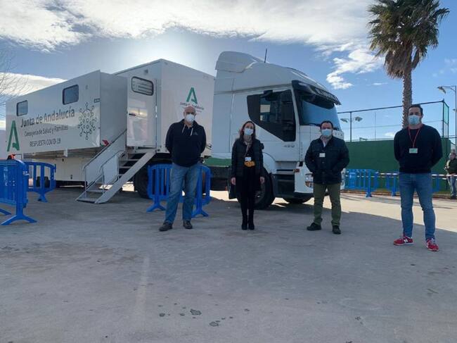Las pruebas se han hecho junto al Pabellón Municipal Príncipe de Asturias, en la unidad móvil de la Consejería de Salud y Familias para la provincia, que ha visitado esta mañana la gerente del Área de Gestión Sanitaria del Campo de Gibraltar Este, Carmen Pajares, con parte de su equipo, para apoyar la labor que allí se realiza.