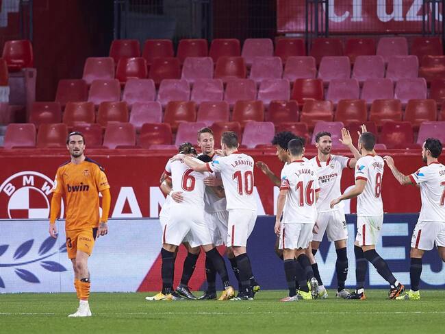 SEVILLE, SPAIN - JANUARY 27: Luuk de Jong of Sevilla FC celebrates scoring his team's opening goal with team mates during the Copa del Rey match between Sevilla FC and Valencia CF at Estadio Ramon Sanchez Pizjuan on January 27, 2021 in Seville, Spain. Sporting stadiums around Spain remain under strict restrictions due to the Coronavirus Pandemic as Government social distancing laws prohibit fans inside venues resulting in games being played behind closed doors. (Photo by Fran Santiago, Getty Images) / Fran Santiago (Getty Images)