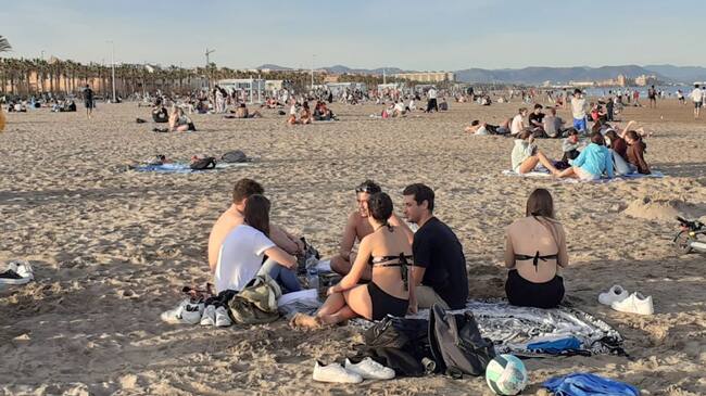 El buen tiempo ha hecho que grupos de jóvenes se reúnen en la arena de las playas de València