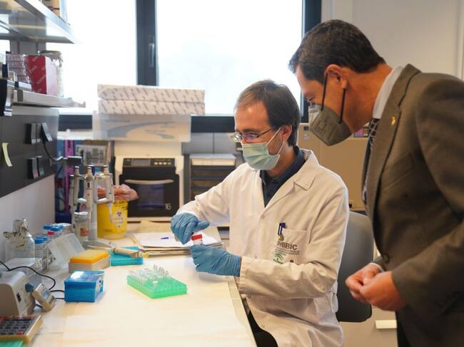 Juanma Moreno observa la labor de un investigador del Imibic. / JUNTA DE ANDALUCÍA (EUROPA PRESS)