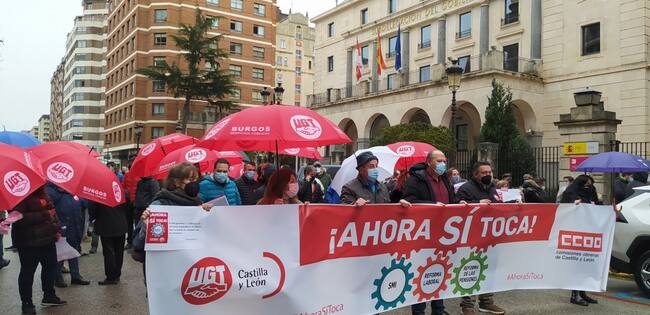 Con el lema #AhoraSiToca, unos 200 afiliados de UGT y CCOO se han concentrado ante la Subdelegación del gobierno en Burgos para reivindicar al ejecutivo que cumpla las promesas electorales que hizo en su día. La subida del Salario Mínimo Interprofesional (SMI) hasta los 1.000 euros al mes, la derogación de las reformas laborales y la garantía de pensiones públicas dignas sin recortes.
