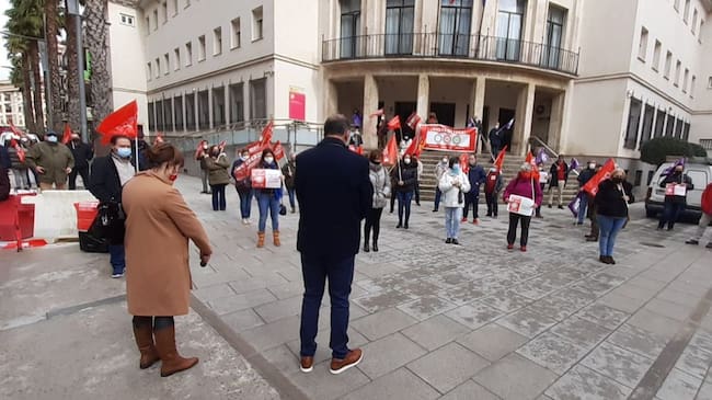 UGT y Comisiones Obreras de Ciudad Real se han concentrado de manera testimonial, con un pequeño número de personas y manteniendo la distancia de seguridad, frente a la Subdelegación del gobierno para reivindicar la subida del salario Mínimo Interprofesional, la derogación de la reforma laboral y también de la reforma de las pensiones.