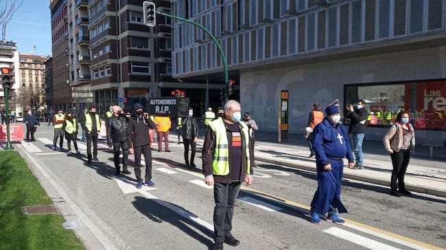 A lo largo del recorrido se ha portado un ataúd con el mensaje 'Autónomos RIP' y, en varios momentos del recorrido, se ha marchado al son de la música de una procesión. Asimismo, se han coreado consignas como 'Módulos sí, peajes no' o 'Chivite kalera'.