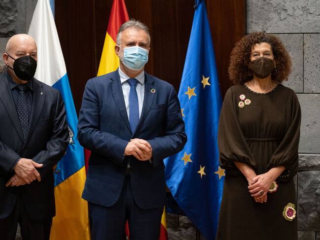 El presidente y la vicepresidenta del CD Tenerife flanquean al presidente del Gobierno de Canarias, Ángel Víctor Torres. / Cadena SER