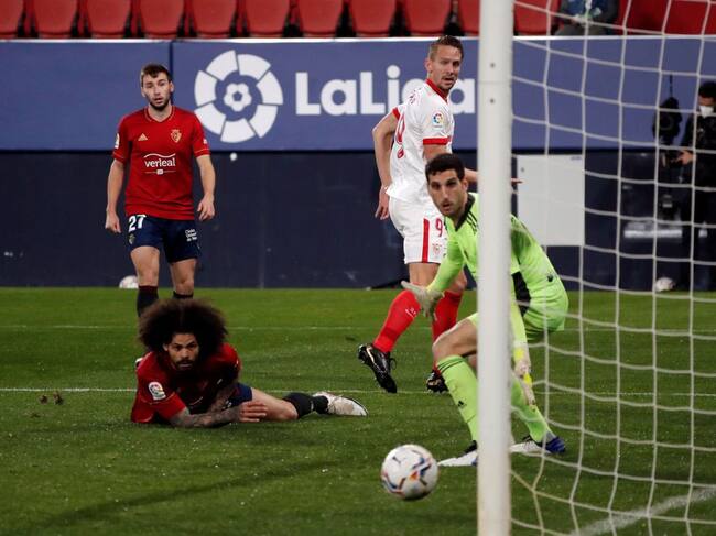 Aridane Hernández y Sergio Herrera ven como De Jong marca el segundo gol del Sevilla en el partido de LaLiga Santander, este lunes en el estadio de El Sadar. / Villar López (EFE)