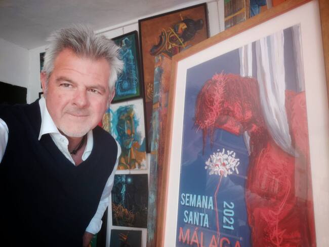 Andrés Mérida posa en su estudio junto al cartel que ha realizado para la Semana Santa de Málaga / Cadena SER