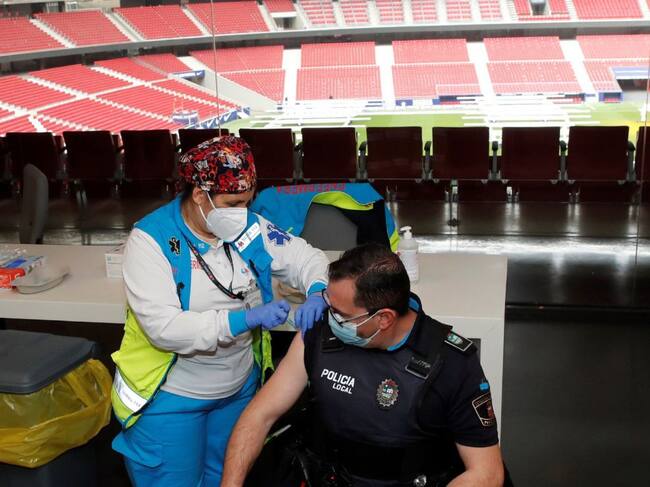 Un policía recibe la primera dosis durante el primer día de vacunación contra la covid-19 en el Wanda Metropolitano. / Juan Carlos Hidalgo (EFE)