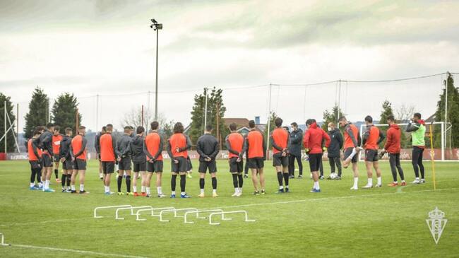 La plantilla rojiblanca durante el entrenamiento de este jueves. / Juan Llavio / Real Sporting