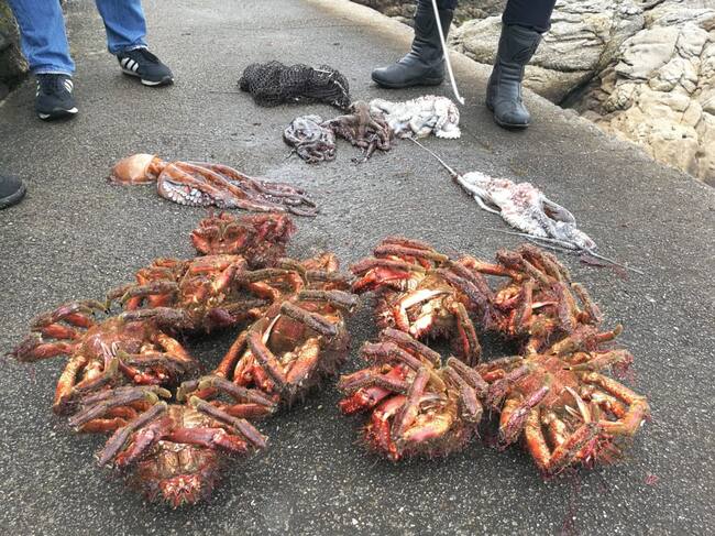 Finalmente, se localizó una red con pulpos y centollas, así como un pincho metálico. La pesca -10 centollos y 5 pulpos- resultó alcanzar en conjunto un peso de 17,44 kilos. Los centollos fueron devueltos al mar por los vigilantes y los pulpos, al estar muertos, fueron entregados en el Comedor de la Esperanza. De la actuación se dio cuenta a la Consellería de Pesca, mediante informe, de cara a una posible sanción.