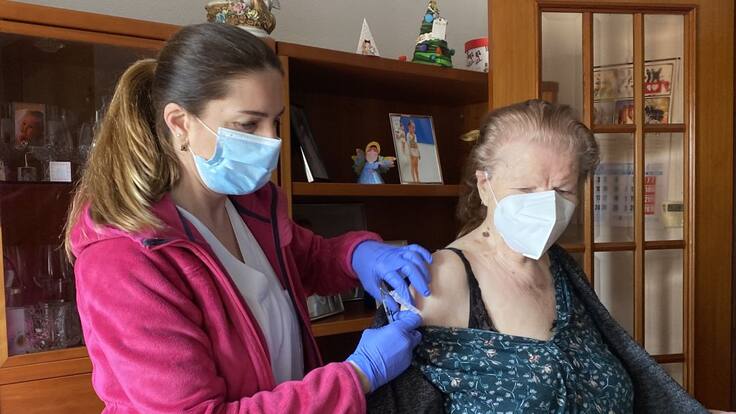 Vicenta Vicent, de 107 años y la persona de más edad del departamento de salud del Doctor Peset de València, ha recibido este jueves la vacuna contra el coronavirus en su casa, a la que se han trasladado las profesionales para administrarle la dosis.