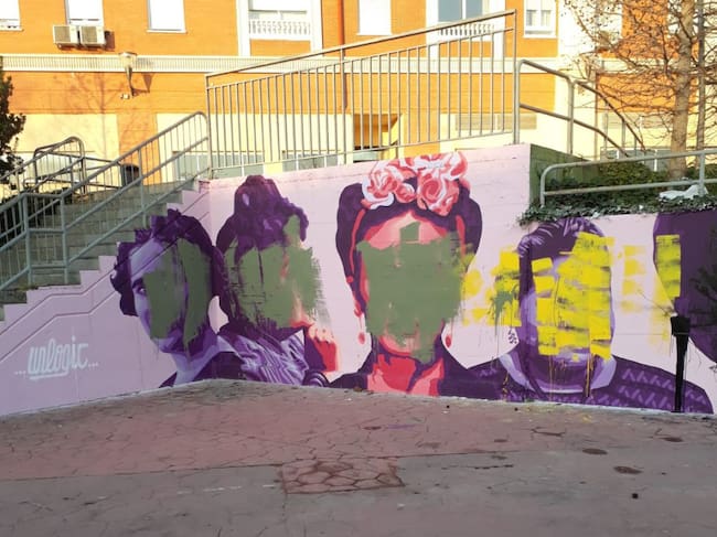 Las caras de las protagonistas del mural aparecieron tapadas con pintura verde y amarilla. / Ayto. de Getafe