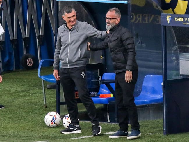 Cervera saluda a Mendilibar, entrenador del Eibar. / Álvaro Rivero. Diario AS
