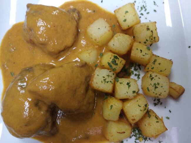 Ponemos unos trozos de carrillera, lo cubrimos con la salsa y acompañamos con patatas fritas en dados.