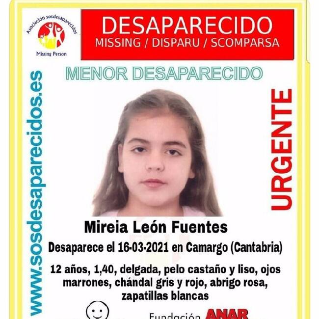 El Centro Nacional de Desaparecidos del Ministerio del Interior ha publicado un alerta sobre la desaparición, el pasado día 16 de marzo, de una menor de 12 años en Camargo.