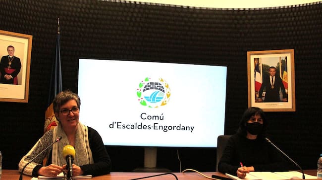 La consellera de Medi Ambient del comú d'Escaldes-Engordany, Cèlia Vendrell, i Montserrat Martell, assessora de projectes estratègics, en la roda de premsa per presentar el bus a la demanda. / M.F.